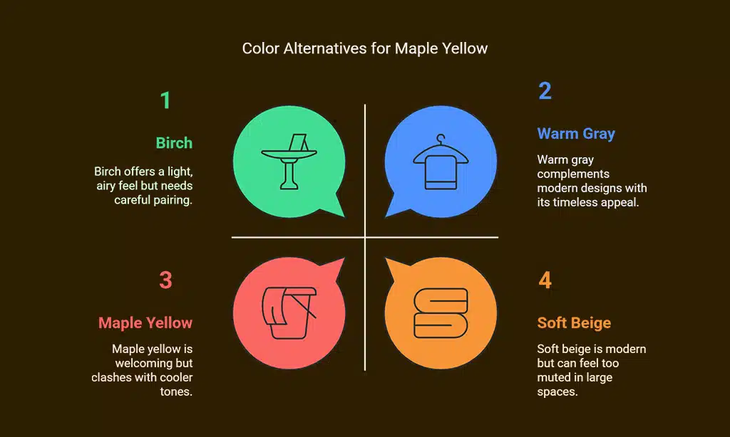 | Maple Yellow | Bright, warm, welcoming | Dated, clashes with cooler designs |