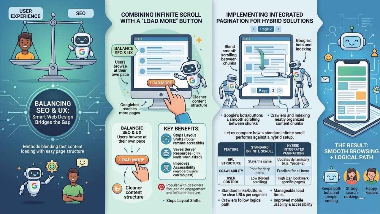 Infinite scroll brings seamless engagement but may trip up both crawlers and folks who like clear boundaries. Pick carefully. Sometimes a “Load More” button or hybrid approach works wonders in balancing organization with smooth browsing.