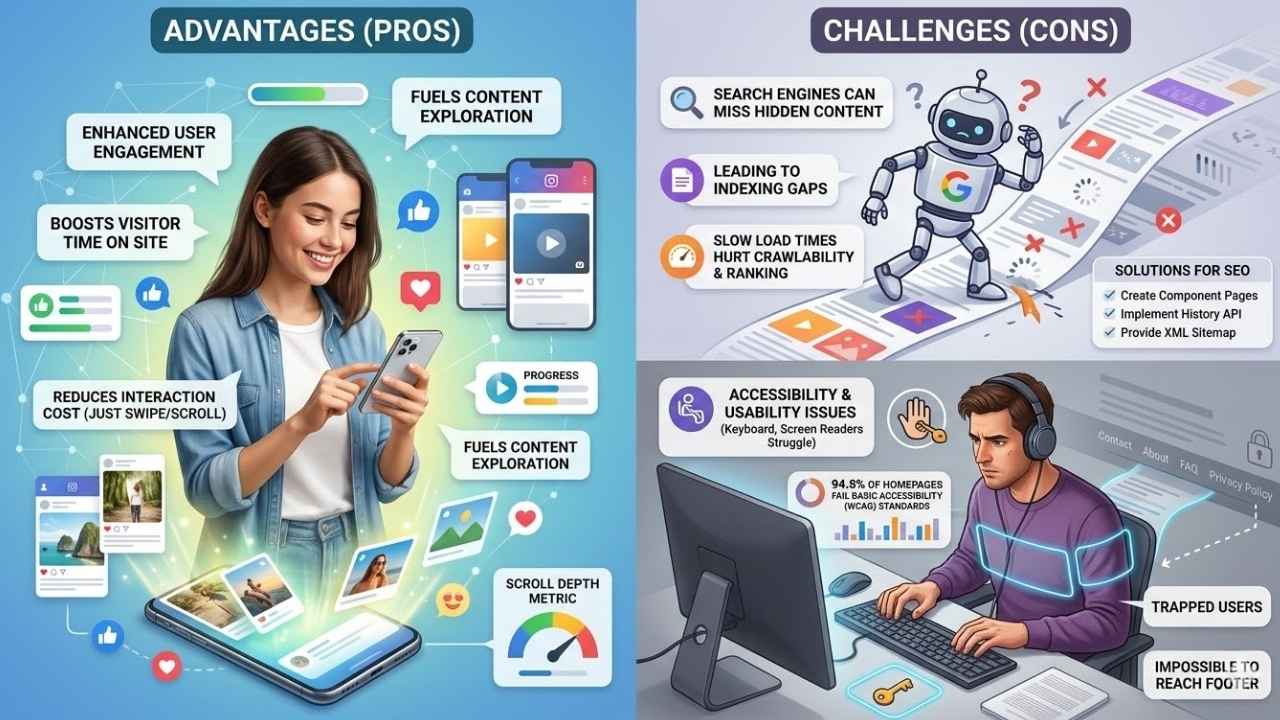 This hurts sites that want every article or item seen, like news platforms or big online shops. Search engines may also miss deeper content if bots cannot crawl past what loads first.