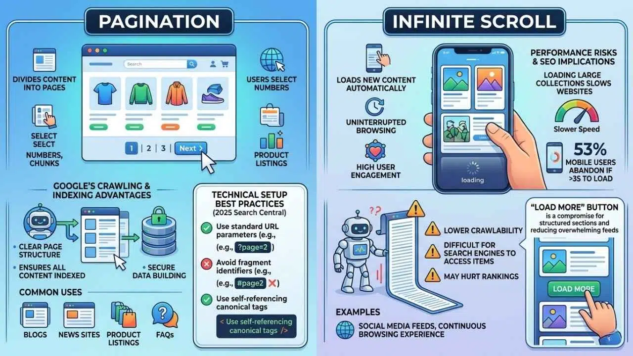 Google’s crawler sometimes misses later posts or product listings because they appear only after lots of scrolling. This leaves parts of your site hidden in plain sight.