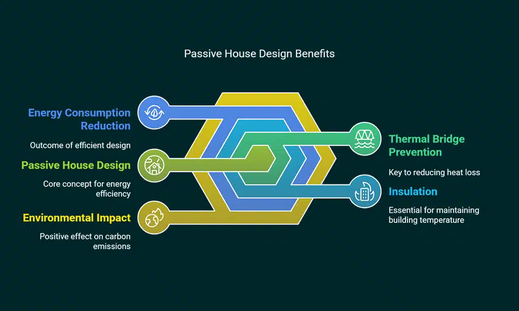 Passive House design focuses on thermal bridging. Thermal bridges let heat escape. This wastes energy. Buildings need good insulation. Good insulation helps trim carbon footprint. Also, it lowers carbon emissions.