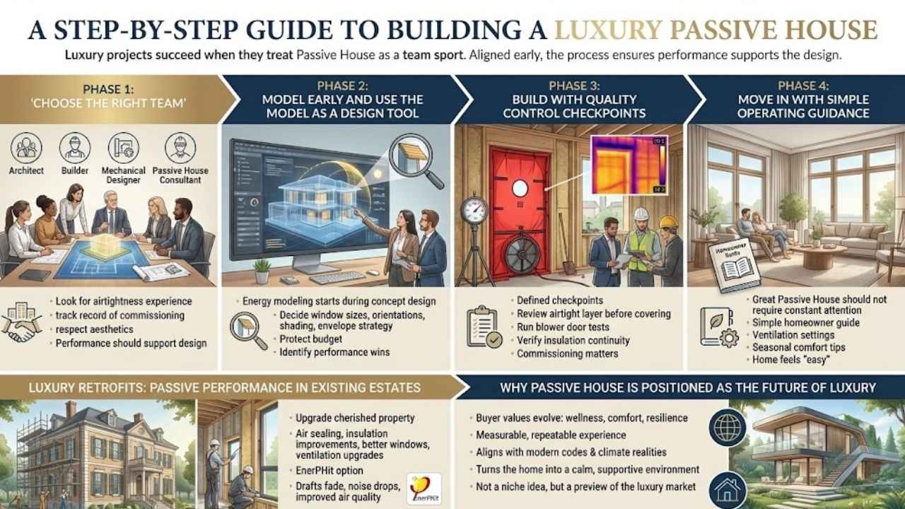 Most luxury projects pursue one of two paths: new-build certification or high-performance retrofit certification. Retrofits often follow EnerPHit, which adapts the method for existing structures where perfect detailing may be harder.