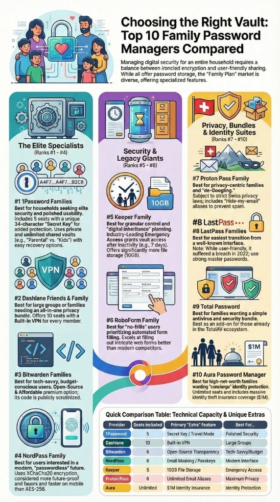 • Best Overall: 1Password Families – The gold standard for its “Secret Key” security and incredibly intuitive vault-sharing system.