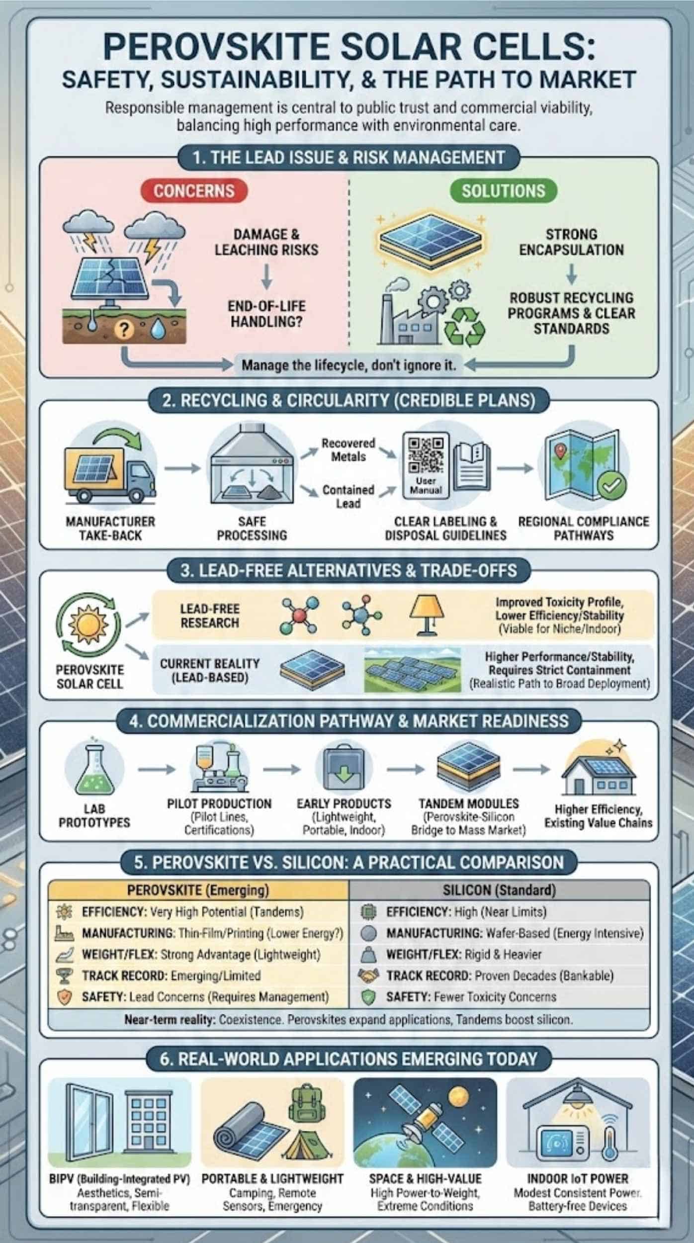 Lead-free perovskite research continues, but it often trades efficiency and stability for improved toxicity profiles. Over time, lead-free options may become viable for certain use cases, especially in indoor devices or niche markets.
