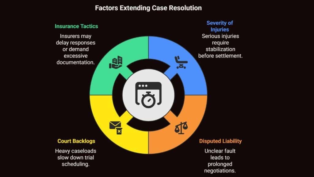 While many cases resolve before trial, several factors can extend the process: