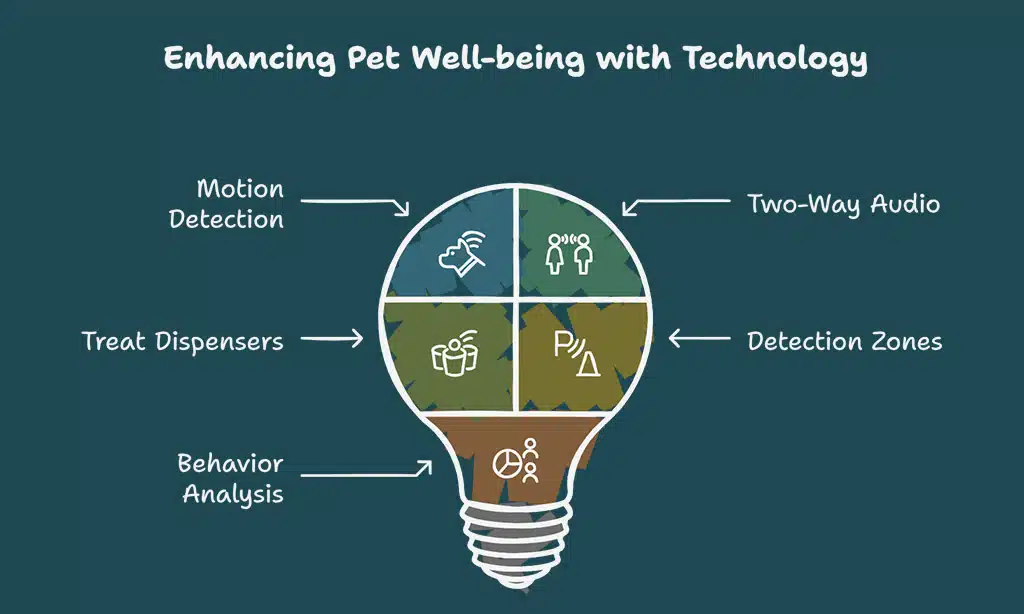 - Using features like treat dispensers and interactive play boosts your pet’s mood. It also gives mental stimulation when pets are home alone.