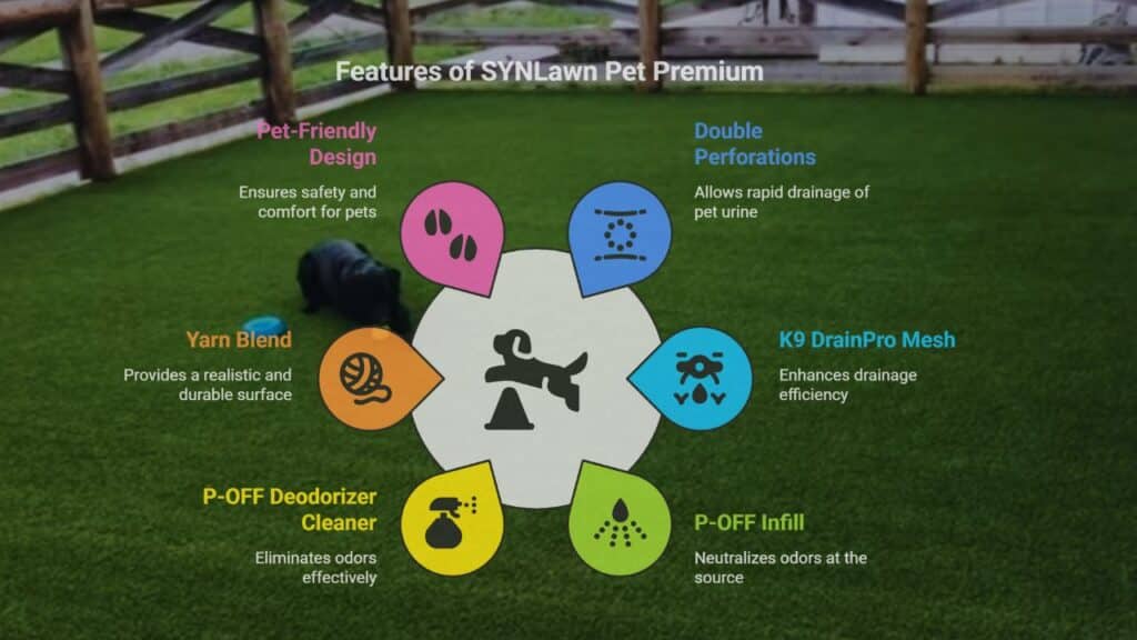 - SYNLawn Pet Premium pairs double perforations with K9 DrainPro mesh. P-OFF infill and deodorizer cut urine smells at the source. A brown-curly/green-straight yarn mix gives a real look. It drains pet mess in seconds. Schools, parks, and kennels use it.