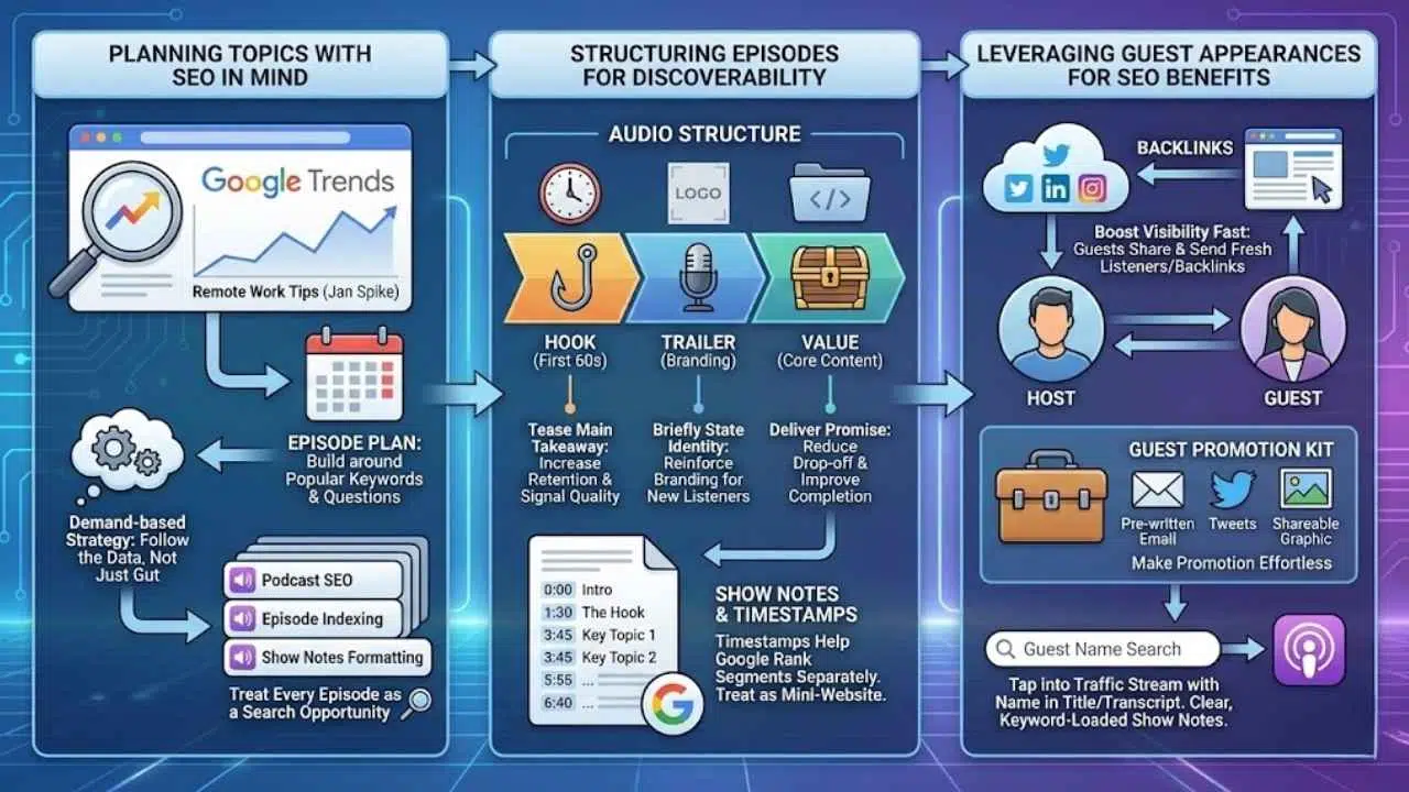 Strong podcast SEO starts with how you set up the audio itself. Use a “Hook, Trailer, Value” structure.