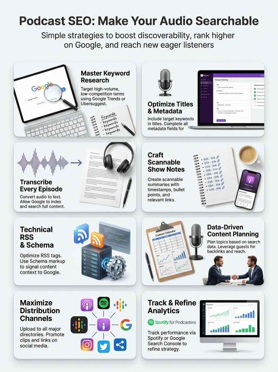 Look at episode titles that spike on analytics charts. That means those keyword-rich topics have real search potential. Examining these numbers regularly helps you fine-tune everything from metadata to transcript accessibility.