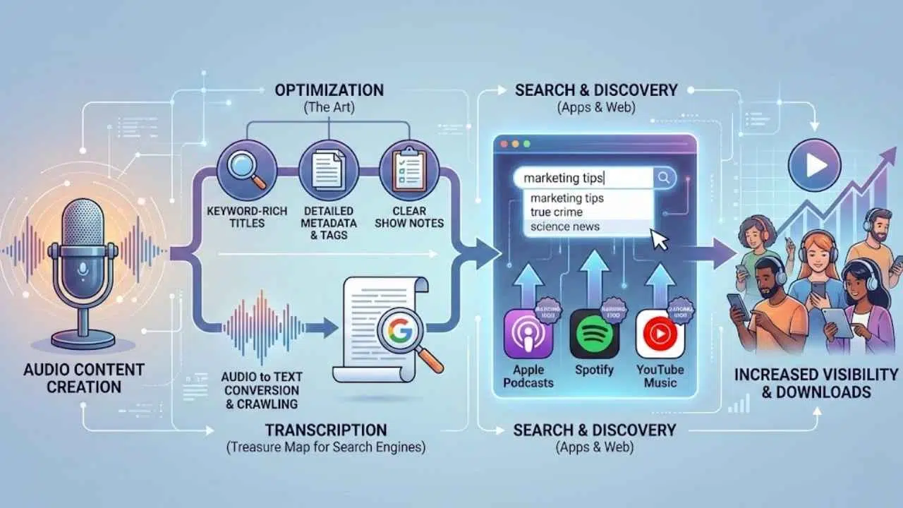 Think about how you use these apps. You usually type a topic like “marketing tips” or “true crime” into the search bar. If your show doesn’t have those words in the right places, you are invisible to the listener. Optimizing means adding keyword-rich titles, detailed metadata, and handy tags to bridge that gap.