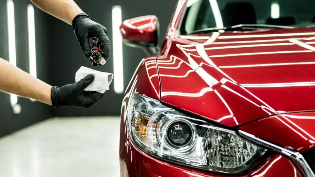 Ceramic Coating is a liquid polymer comprising nano-ceramic particles that bond with the vehicle’s exterior after application. The result is a thin, smooth, hydrophobic layer that protects the car from environmental pollutants, UV Rays, and oxidation. The properties of ceramic coating make it easier to clean since water and dirt slide off the car’s surface easily. Some ceramic coatings combine silicon dioxide and titanium dioxide to provide the best of both worlds; these hybrid coatings offer exceptional durability while being easy to apply.