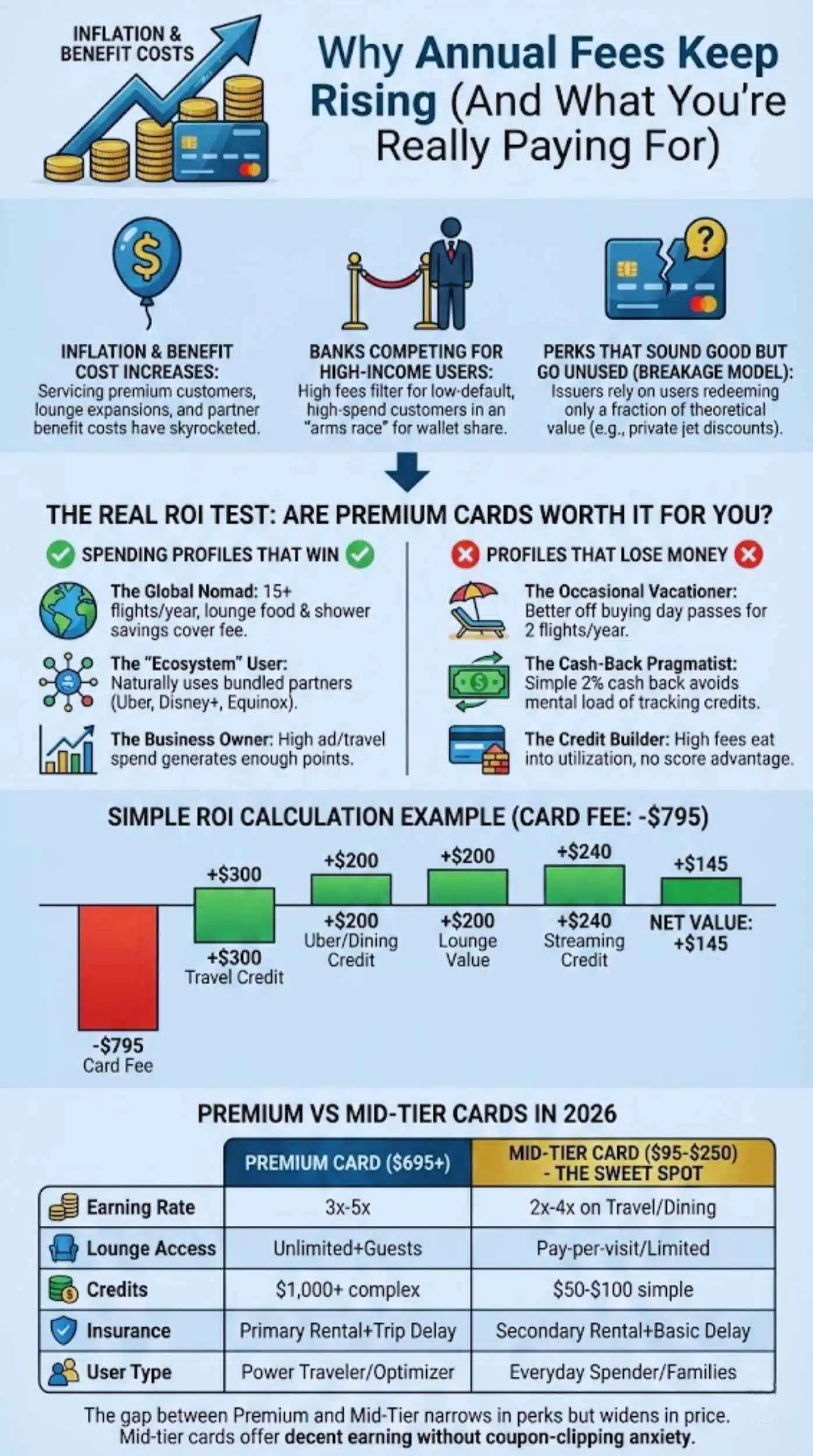 - The “New Normal” Price Tag: Annual fees for flagship premium cards have jumped to the $695–$895 range, driven by inflation and higher service costs.