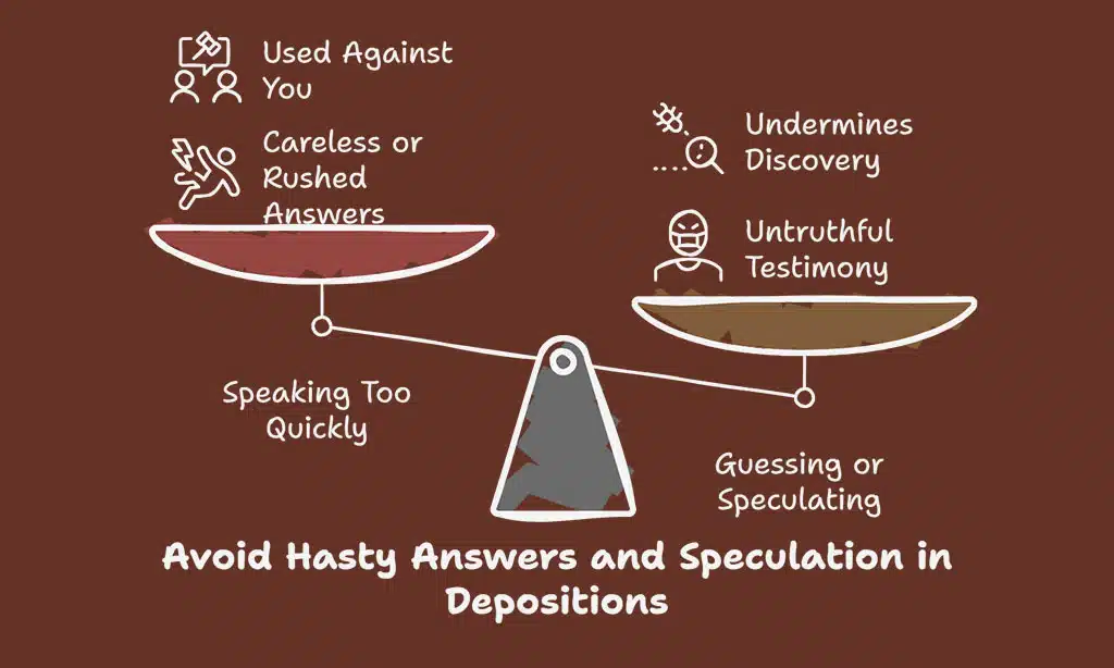 Avoid guessing answers. Clear communication protects your truthful testimony and the deposition transcript’s accuracy. It also stops misunderstandings during the discovery process later on.