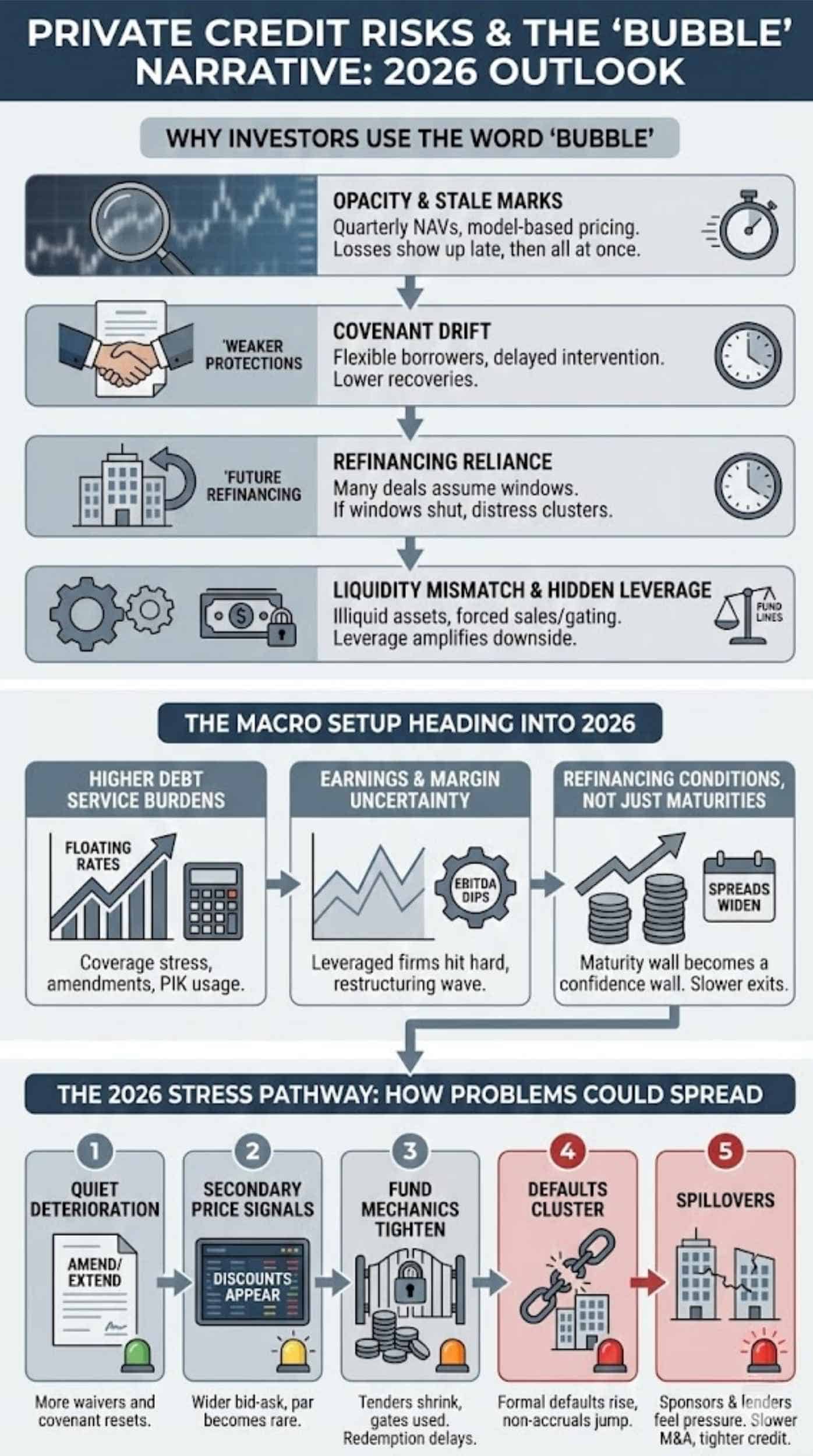 | “Bubble” concern is about structure, not just losses | Opacity + liquidity expectations can turn small cracks into fast repricing | Fund leverage lines, redemption pressure, clustered restructurings |