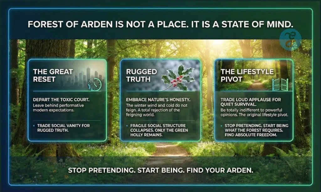 The Forest of Arden is not a map coordinate on a globe. It is a state of mind. It is a radical departure from the exhaustion of modern expectations. In Shakespeare’s famous play As You Like It, the main characters flee a toxic and performative court. They leave their finery behind to find themselves in the woods. This is the first recorded instance of the great reset. By quitting the performance, they trade social vanity for rugged truth. This is how they find a life that is truly most jolly.