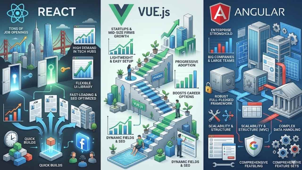 Pick based on your project size, since small sites love Vue’s light touch, teams crave React’s vast add-ons, and enterprises rely on the structured setup for smooth scaling. This decision boosts your code speed, cuts bugs, and opens job doors in tech hubs everywhere.