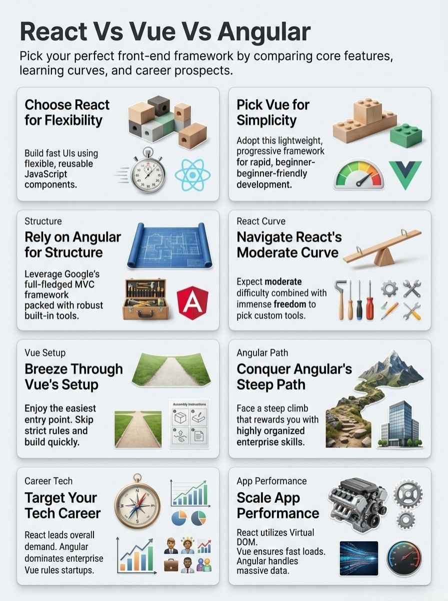 You face a big choice with React, Vue, and that other front-end tool from Google, each shining in different spots like React’s flexible components for quick builds, Vue’s easy start for new coders, and the full package for big apps.
