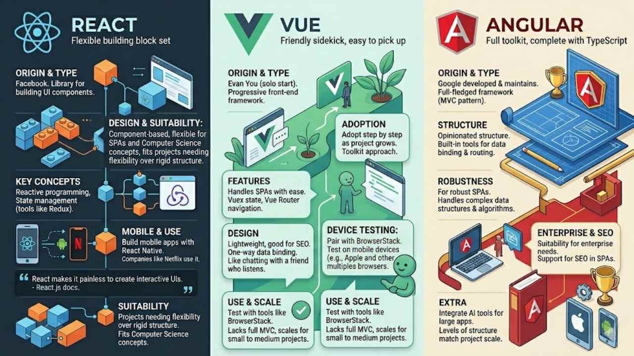Hey, if you’re dipping your toes into front-end development, you might wonder about these big players that power modern web apps. React acts like a flexible building block set, letting you craft user interfaces with JavaScript, while Vue feels like a friendly sidekick that’s easy to pick up for quick projects, and Angular steps in as the full toolkit, complete with TypeScript support for those enterprise-level single-page applications.