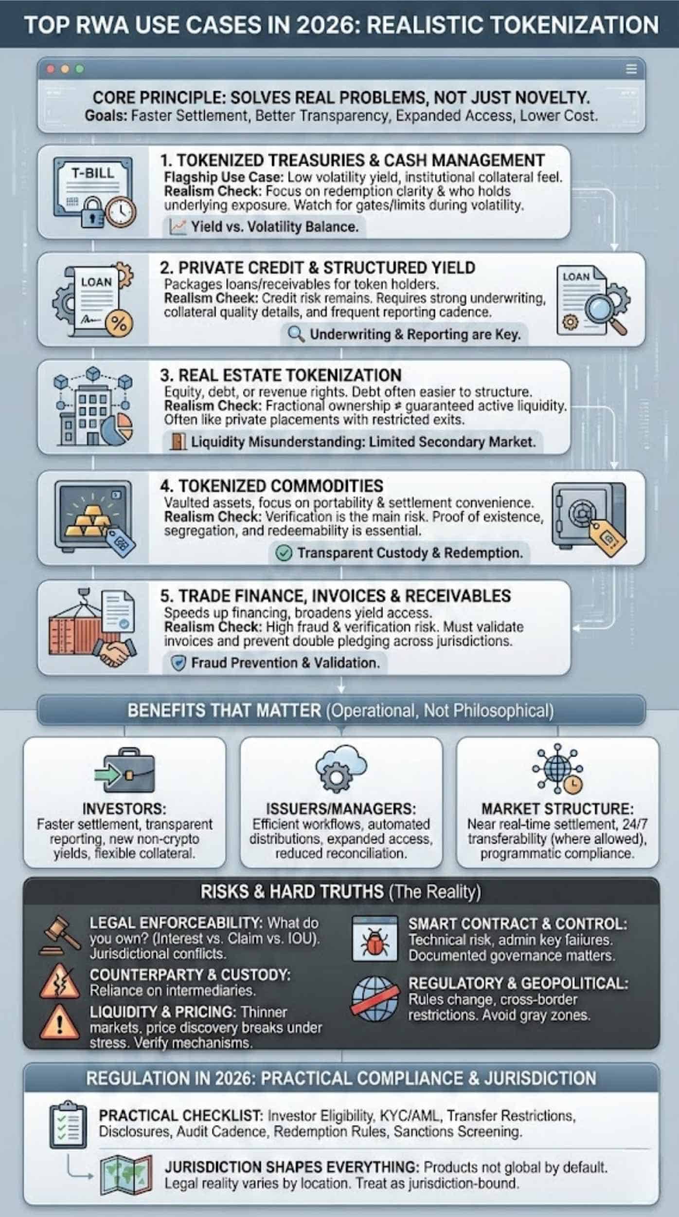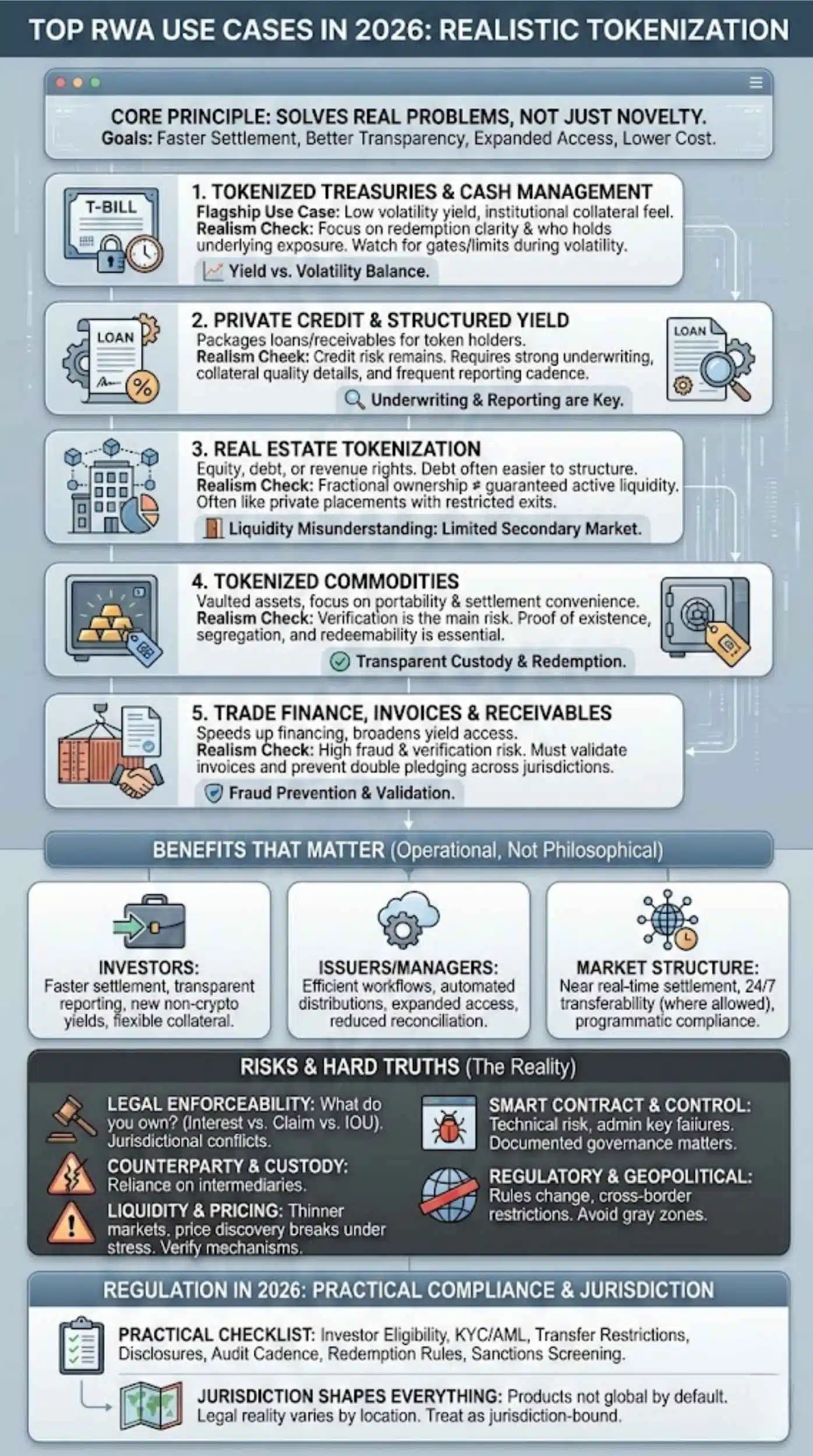 RWAs work best when tokenization solves a real problem, not when it only adds novelty. The strongest use cases reduce settlement time, improve transparency, expand access where allowed, or lower operational cost.