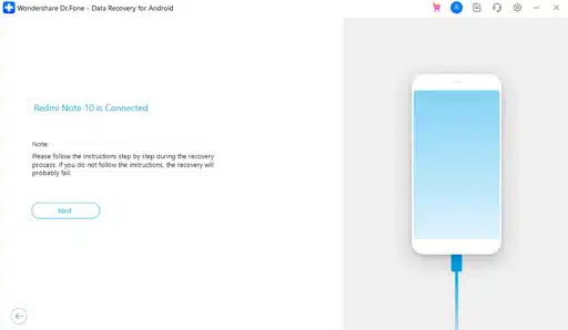 Upon seeing the next screen, choose the “Recover WhatsApp Data” feature and then link your mobile to the computer. When your phone is detected and shown, press the “Next” button.