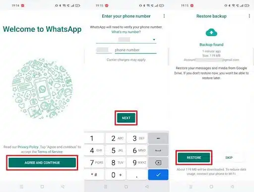 Step 3. Upon installing and launching, press the “Agree and Continue” button and enter the same phone number. After that, hit the “Next” button and tap “Restore” upon reaching the “Restore Backup” screen.