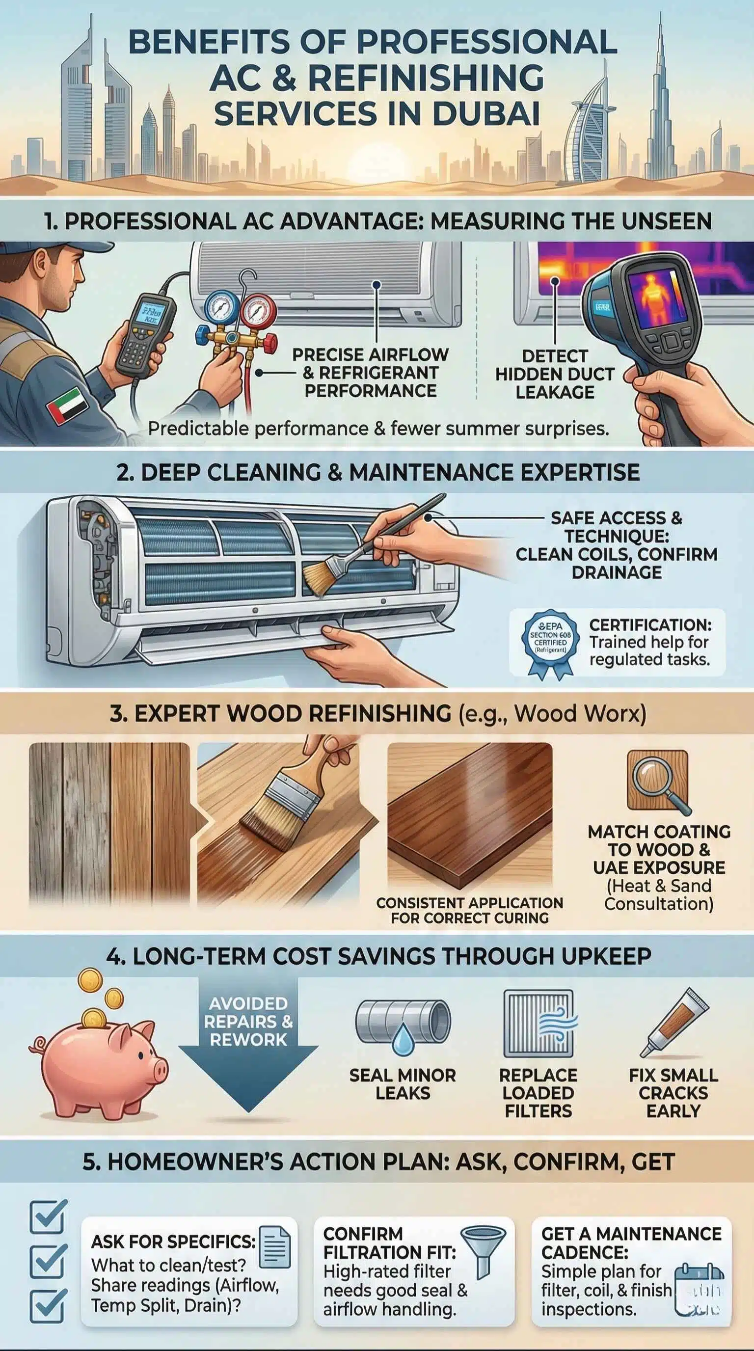 In a desert city, you do not win by reacting late. You win by controlling dust paths, moisture, and heat load before they show up as wear. Use these Desert-ready Refinishing Tips For Heat, Sand, And Strong AC Cycles In Dubai to keep cooling systems efficient and finishes stable. Stay consistent with air conditioning maintenance: keep filters clean, seal ducts, and keep coils and drains in good shape.