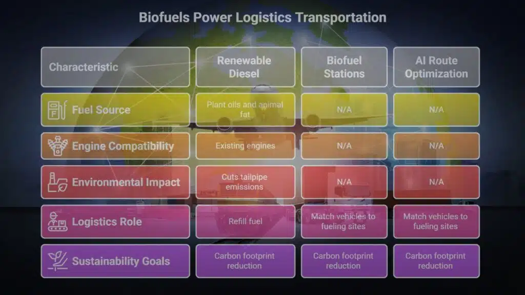 Trucks swap fossil diesel for renewable diesel in existing engines. This blend burns cleaner and cuts tailpipe emissions. Drivers refill at biofuel stations along major routes. Some carriers use AI and route optimization to match vehicles to fueling sites.