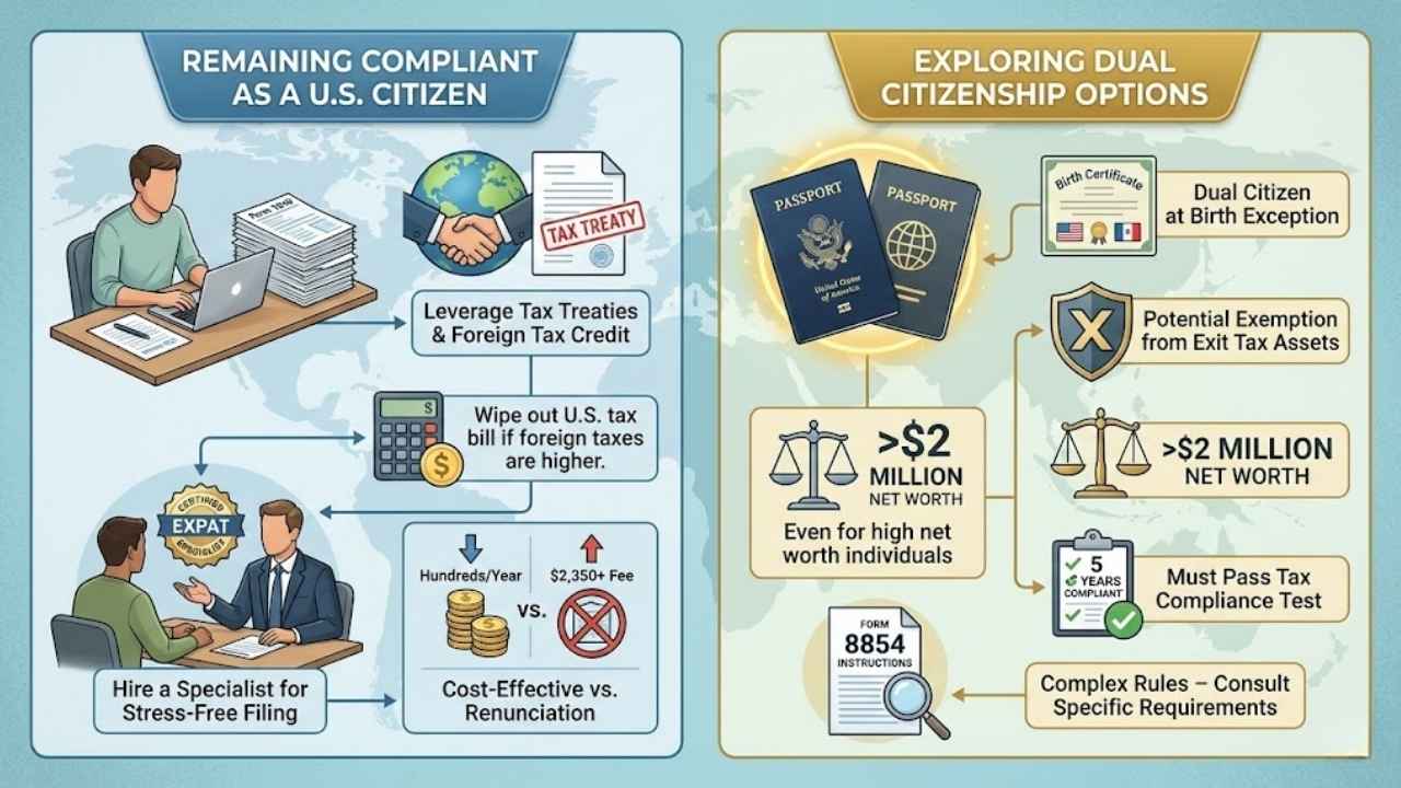 The IRS has an exception for dual citizens at birth. You can be exempt from the Covered Expatriate status even if your net worth is over $2 million. You still have to pass the tax compliance test, but you can avoid the exit tax on your assets. This is a complex rule, so check the specific requirements in the Form 8854 instructions carefully.