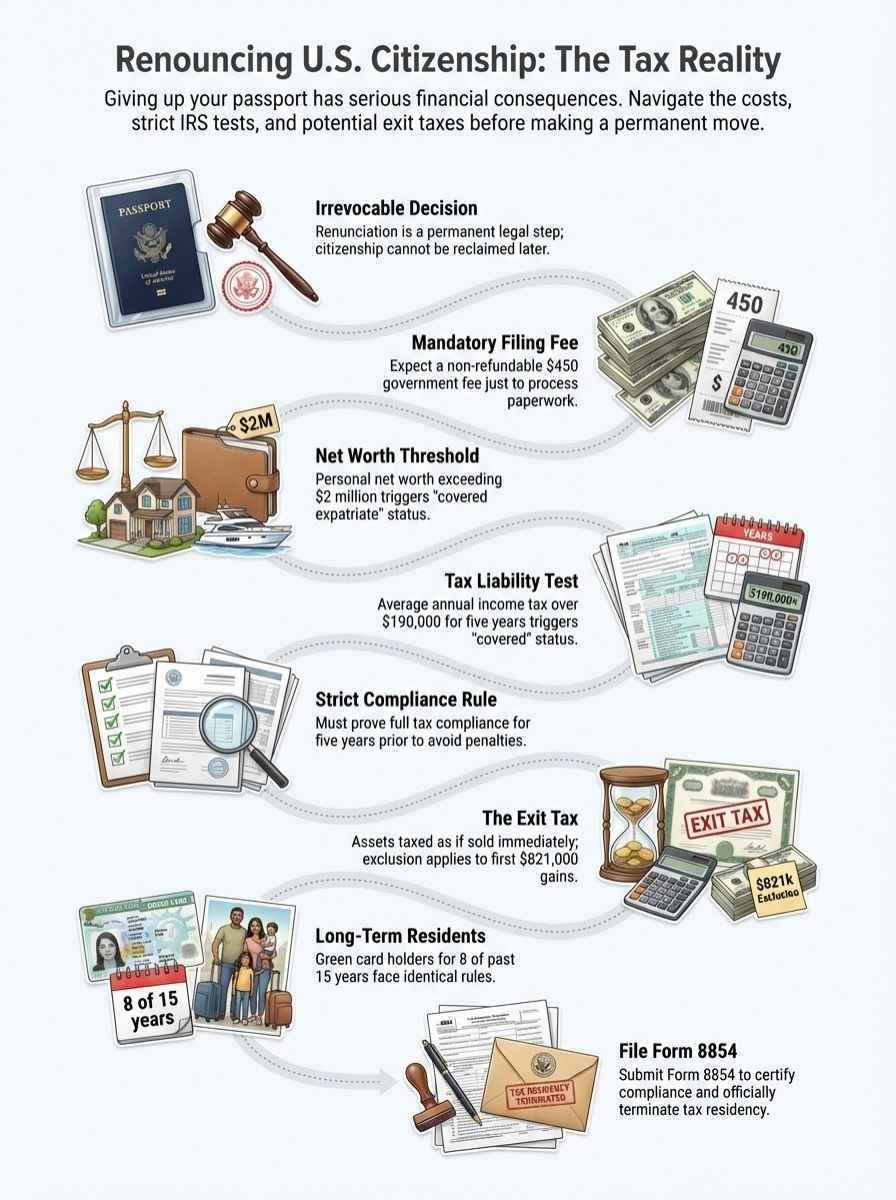 Renouncing your citizenship is a life-changing event with serious math attached to it. You have to navigate the $2,350 fee, the strict Covered Expatriate tests, and the final “deemed sale” tax. The secret to a smooth exit is preparation. Check your net worth against the $2 million limit. Ensure your last five years of taxes are flawless. And most importantly, do not ignore the forms. If you plan carefully, you can turn the page to your new chapter without owing Uncle Sam a parting gift. Take a deep breath, gather your documents, and take it one step at a time.