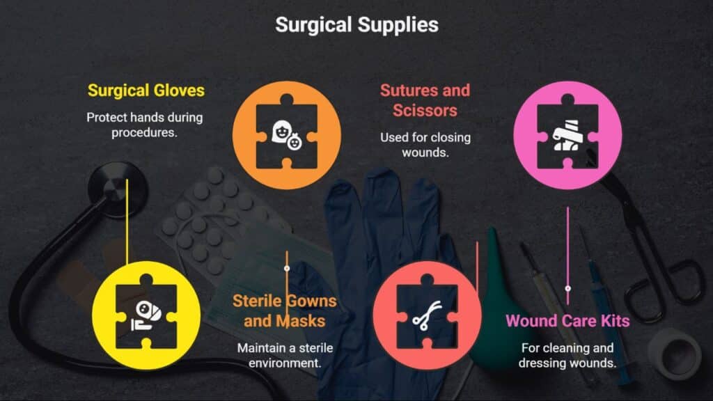 Surgical supplies are the backbone of emergency care. These include: