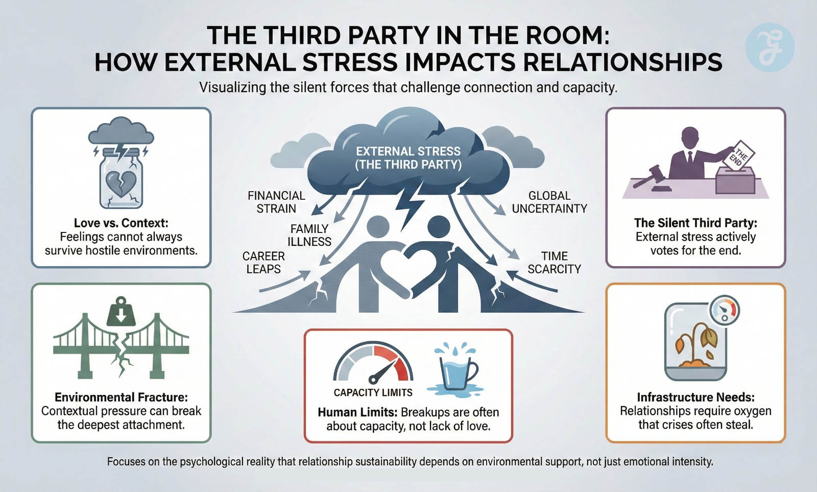 We often assume breakups occur solely due to a lack of love. In reality, contextual factors are frequently the primary drivers of dissolution. External stress acts like a third person in the room; it sits at the table and votes for the end. Financial strain, family illness, or career leaps are not merely background noise, they are active participants in the relationship’s survival.
