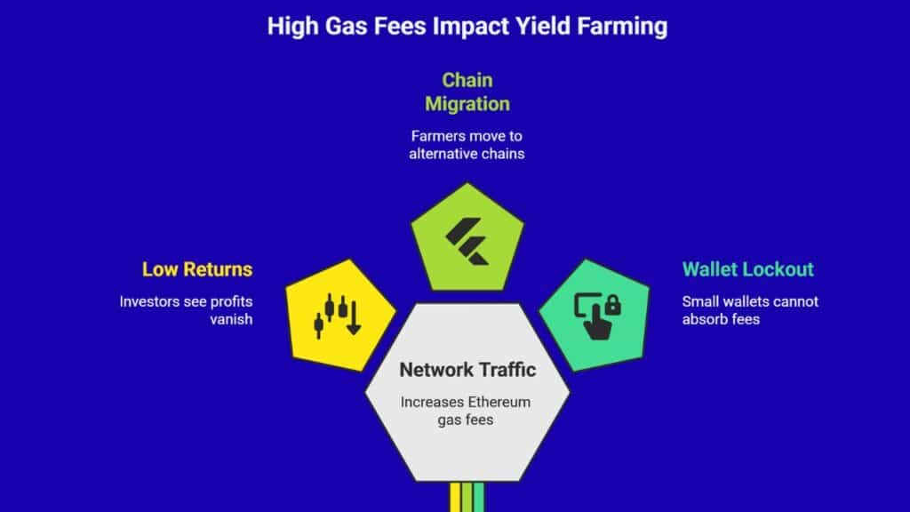 Yield farming pools can face liquidity shortages and lock liquidity providers in. Gas fees may spike by up to 100x during network congestion. Locked tokens can fall in price before you exit.