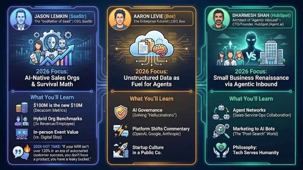 Jason Lemkin has seen every cycle, from the dot-com crash to the ZIRP (Zero Interest Rate Policy) boom, and now, the AI consolidation. While others panic about AI replacing SaaS, Lemkin is providing the math to survive it. In 2026, his content has shifted from “How to hire a VP of Sales” to “How to structure a sales team when AI Agents do 80% of the prospecting.”