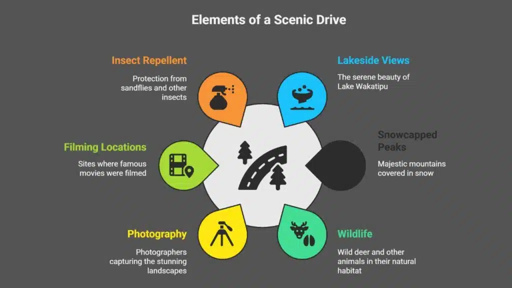 Cars hug the shoreline of Lake Wakatipu. The road twists around coves, past reed beds, toward snowcapped peaks. Photographers set up a DSLR and a sturdy tripod on gravel pullouts. They aim at towering summits, wild deer, and the glittering water.