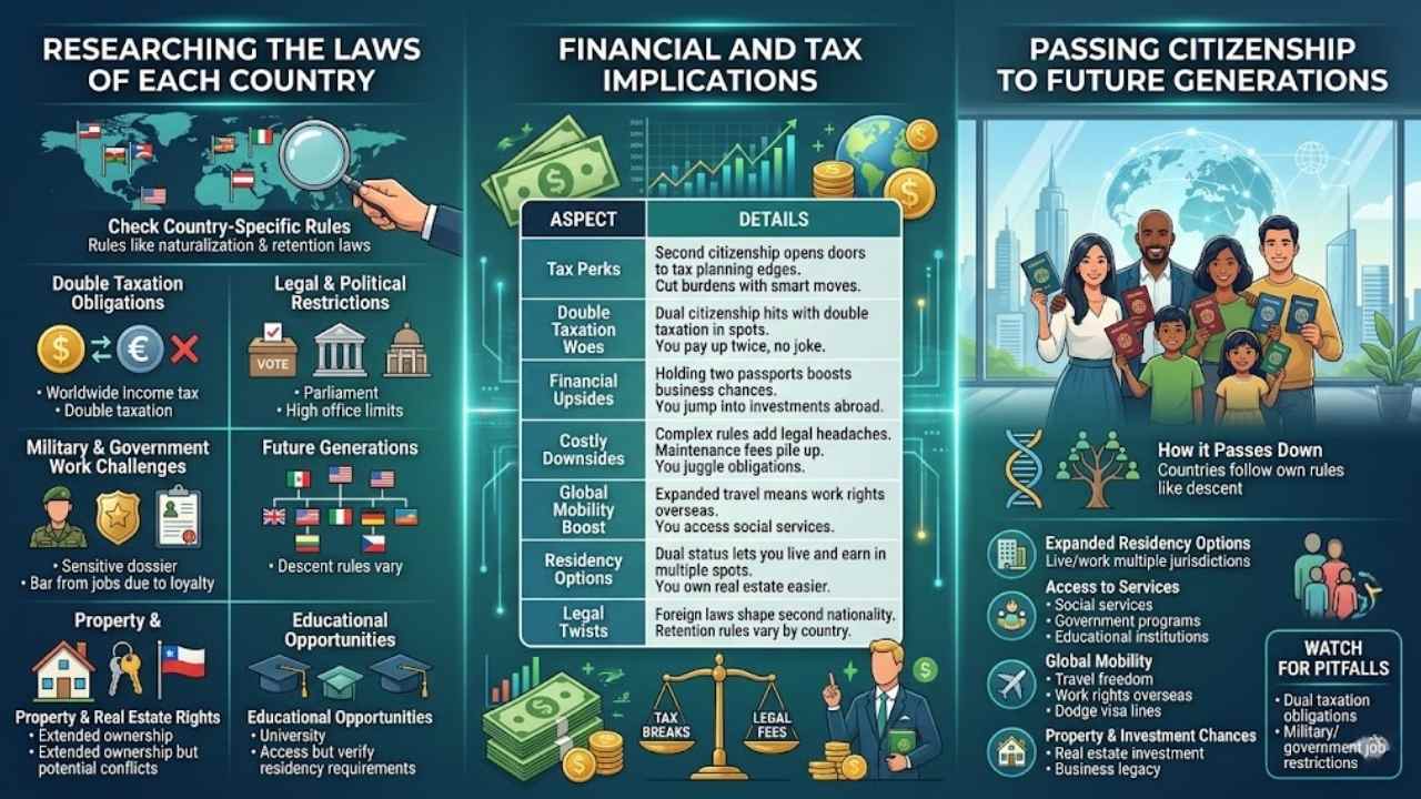 | Legal Twists | Foreign laws shape your second nationality. Retention rules vary by country. You plan ahead to pass it on. Kids might inherit the perks, or the pitfalls, depending on setup. |