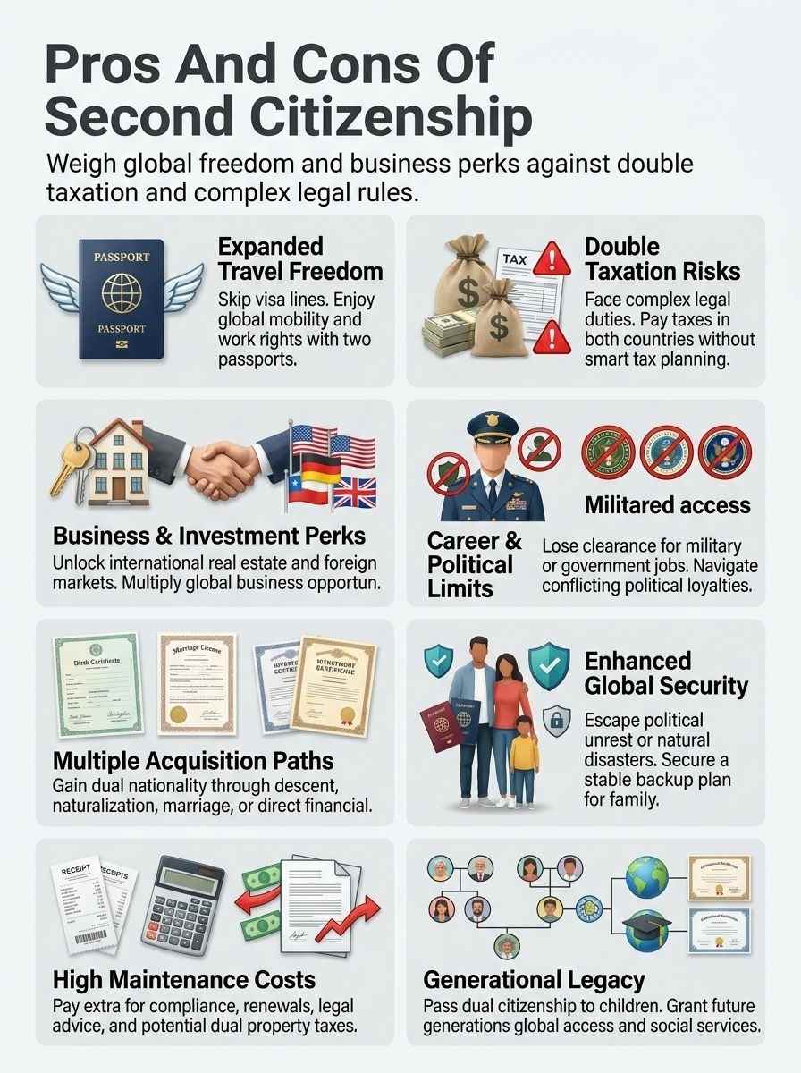 Second citizenship opens doors to better travel, business chances, and safety nets across borders. You gain real perks like visa-free trips and education options, but watch out for tax hassles and legal snags.
