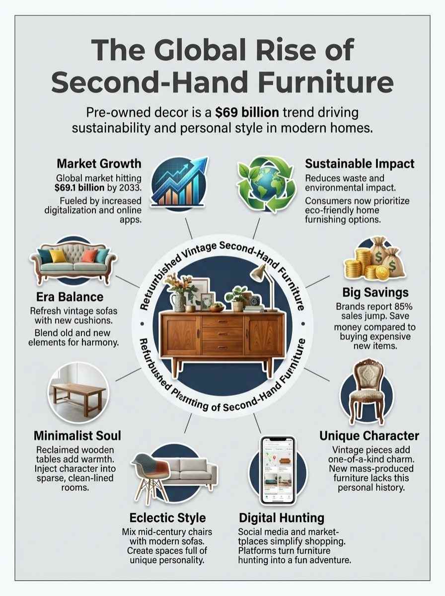 The global second-hand furniture market is projected to reach USD 69.1 billion by 2033, driven by platforms like Facebook Marketplace, Craigslist, and eBay. Pre-owned pieces are reshaping modern interiors by blending affordability, sustainability and character.