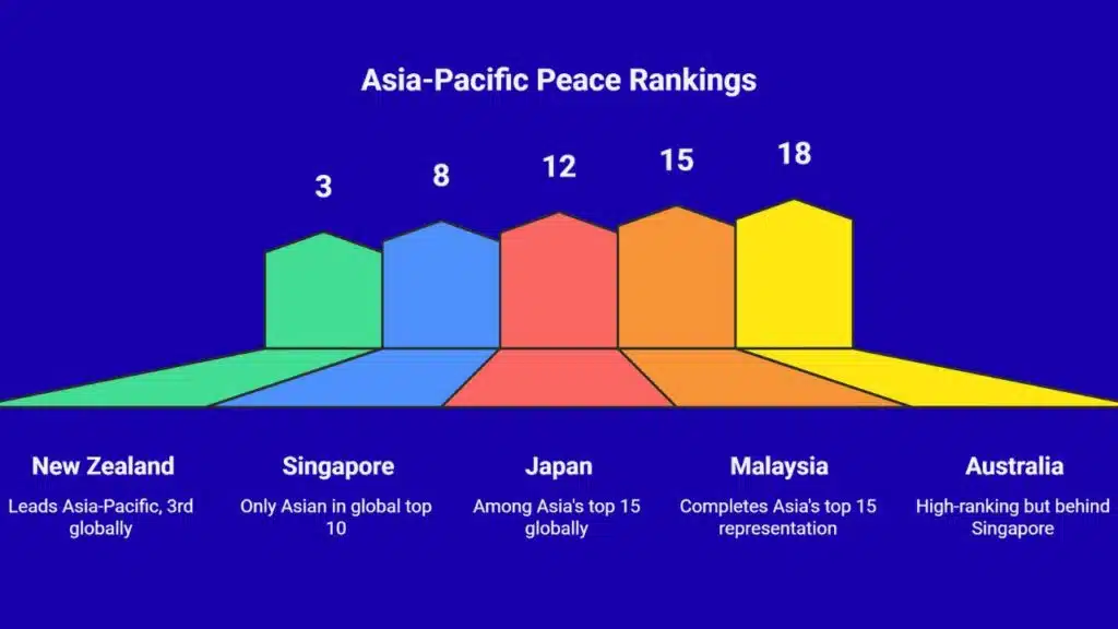 This contrast shows how small, well-governed nations can often perform better on peace metrics compared to larger powers in the region, which face internal conflicts, security dilemmas, or geopolitical tensions.