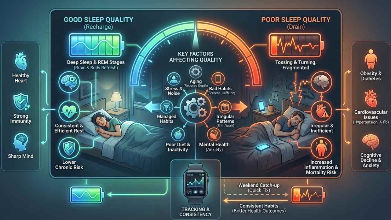 You get deep sleep and rapid eye movement (REM) sleep stages that refresh your body and mind. Poor sleep quality hits hard, linking to obesity, diabetes, and cardiovascular diseases like hypertension and atrial fibrillation.