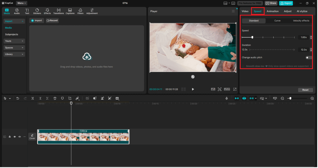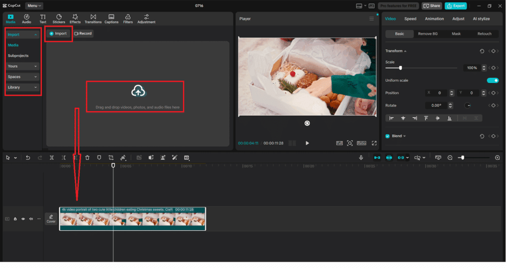 Launch CapCut Desktop and press “New project” to start. Then, copy your video and paste it in the Media panel or use the “Import” button in the top left corner. After appearing in your media library, drag the clip onto the timeline. Ensure that the video you are supposed to slow down is in the right location in order to apply the effect normally.