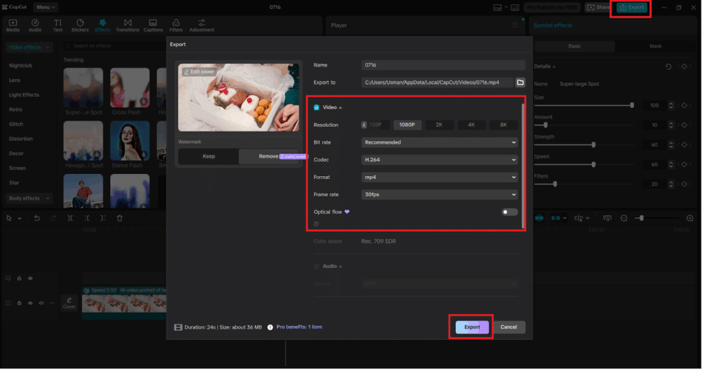 Your video is now slowed, and to ensure you watch it, press Play. However, you can split or trim the clip and leave in slow motion just the portion you like if the moment seems to be inappropriate. You can, too, to add a fade-in/ fade-out or a blurry slide in/out at the beginning and/or end of the slowed-down portion to add a cinematic touch. Applying any other visual effects. If you need to add some visual effects, use the “Effects” or “Transitions” tab in the top menu. CapCut has many filters and motion effects powered by AI that can work smoothly with slow-motion effects.