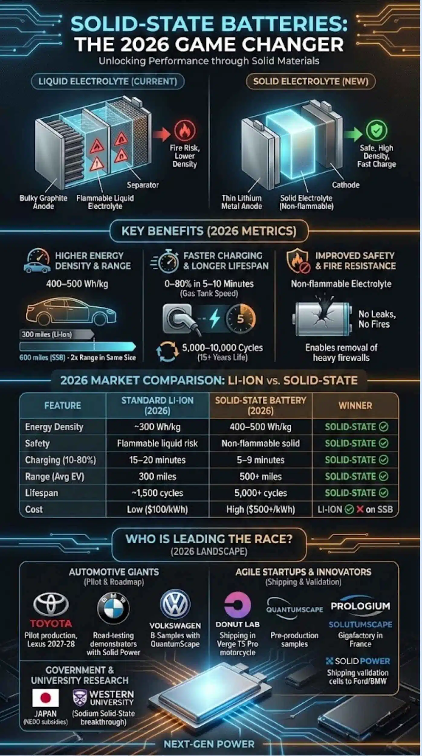 We are witnessing the most significant shift in energy storage since the 1990s. While lithium-ion will remain the workhorse of the economy car for the next decade, the “flagship” experience has fundamentally changed. If you are looking at the cutting edge of automotive or tech in 2026, look for the solid-state label—it is the new gold standard for performance, safety, and longevity.