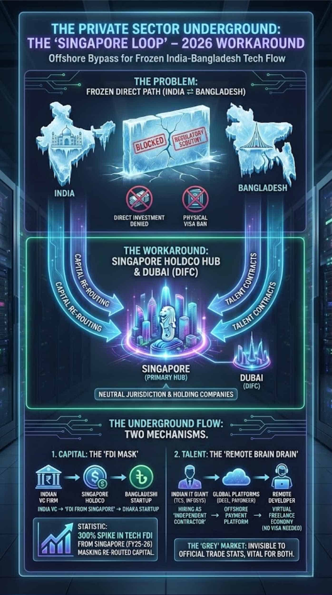 - Statistics: The Bangladesh Bank reported a 300% spike in FDI from Singapore in the tech sector in FY25-26, masking the reality that much of this is actually re-routed Indian capital.