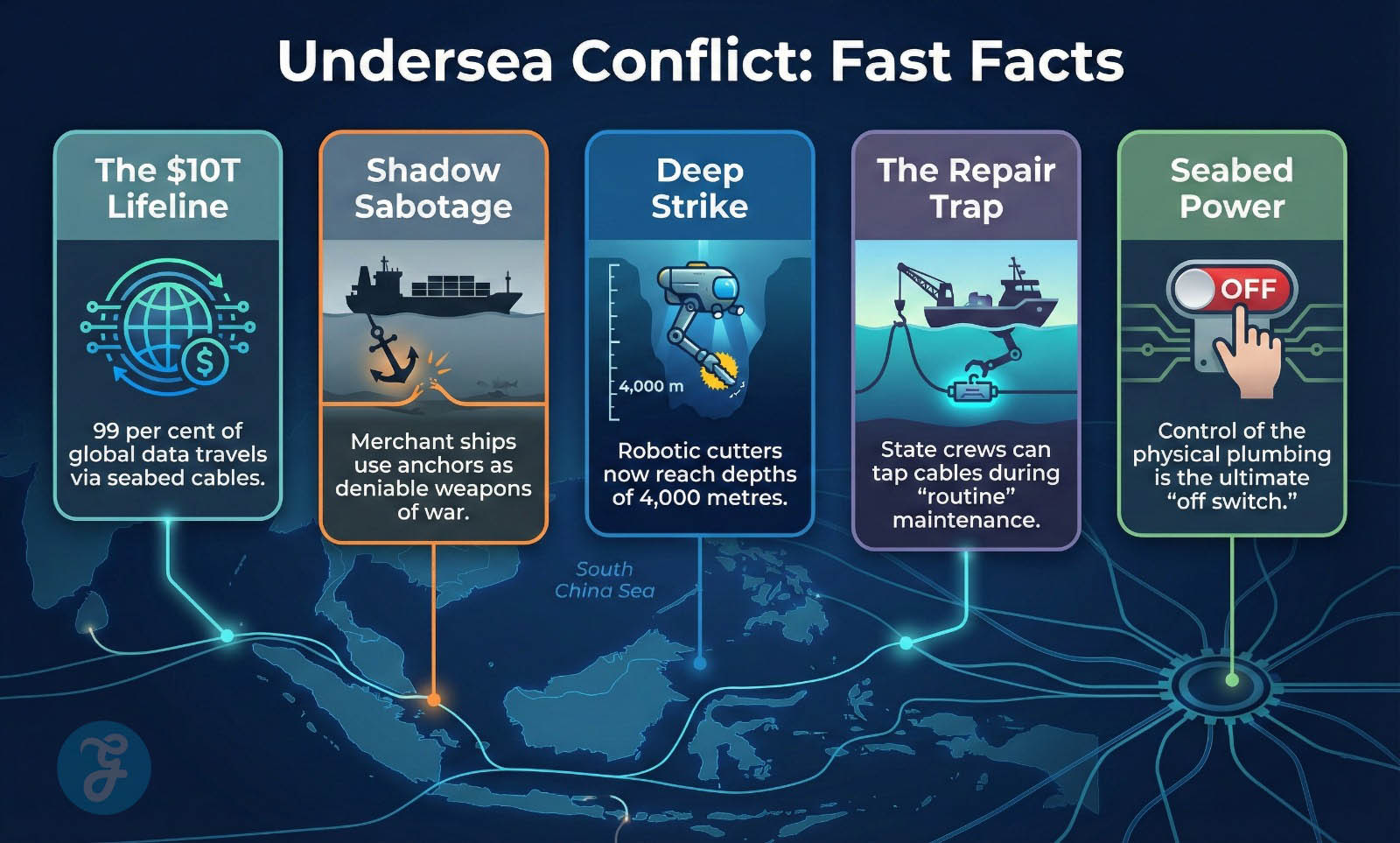 We are currently fixated on the “theatre” of the South China Sea, the fighter jet intercepts and the artificial island fortresses. But this is a distraction. The real war is being fought in the dark, thousands of metres below the keel. It is a struggle for the 1.4 million kilometres of fibre-optic cables that serve as the central nervous system of our global existence.