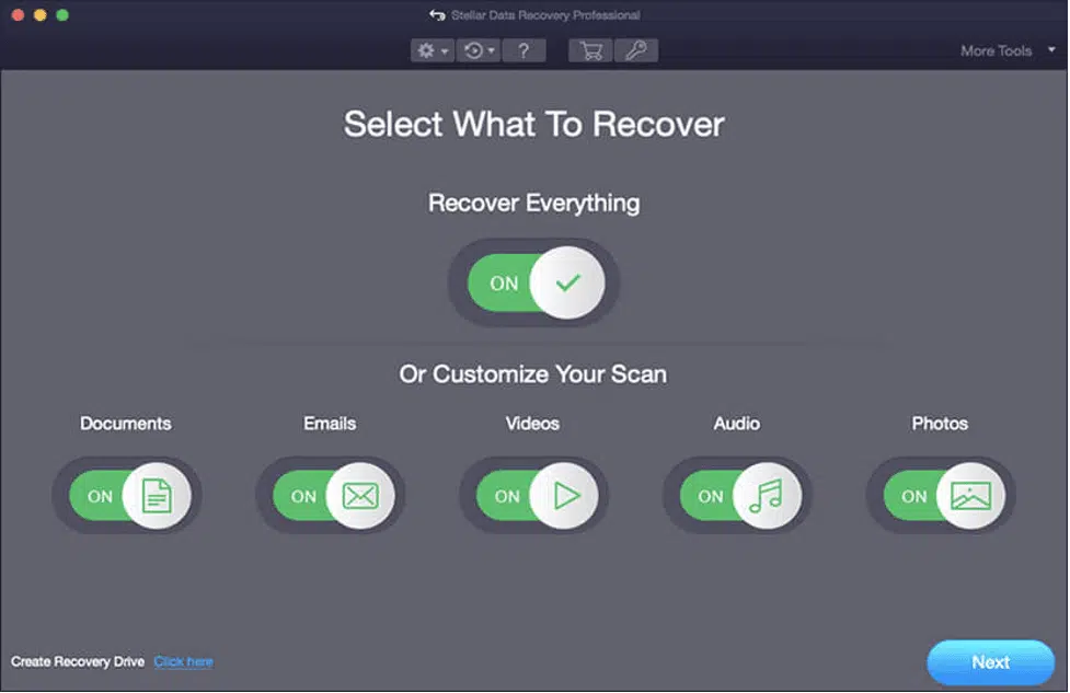 Step 1: Open the software and turn on all of the relevant buttons (documents, emails, videos, audio, and images). Toggle on the recover everything’ button to recover all types of data.
