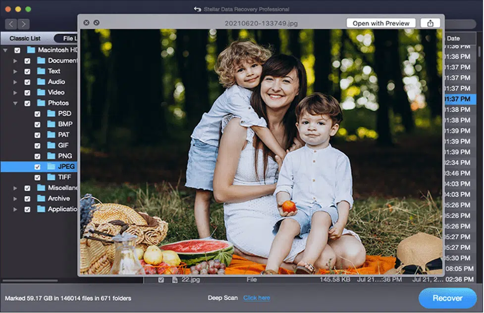 Step 5: Once you’re happy with the file preview, pick the files you want to recover and click ‘Recover.’ Choose a location to save the files you’ve recovered. Stellar Data Recovery Professional for Mac gives you the ability to recover all of your lost or deleted files. In addition, the software recovers important files from Time Machine backups, BootCamp partitions, empty trash, volume formatting, inaccessible storage devices, unmounted hard discs, encrypted HDDs, and other locations.