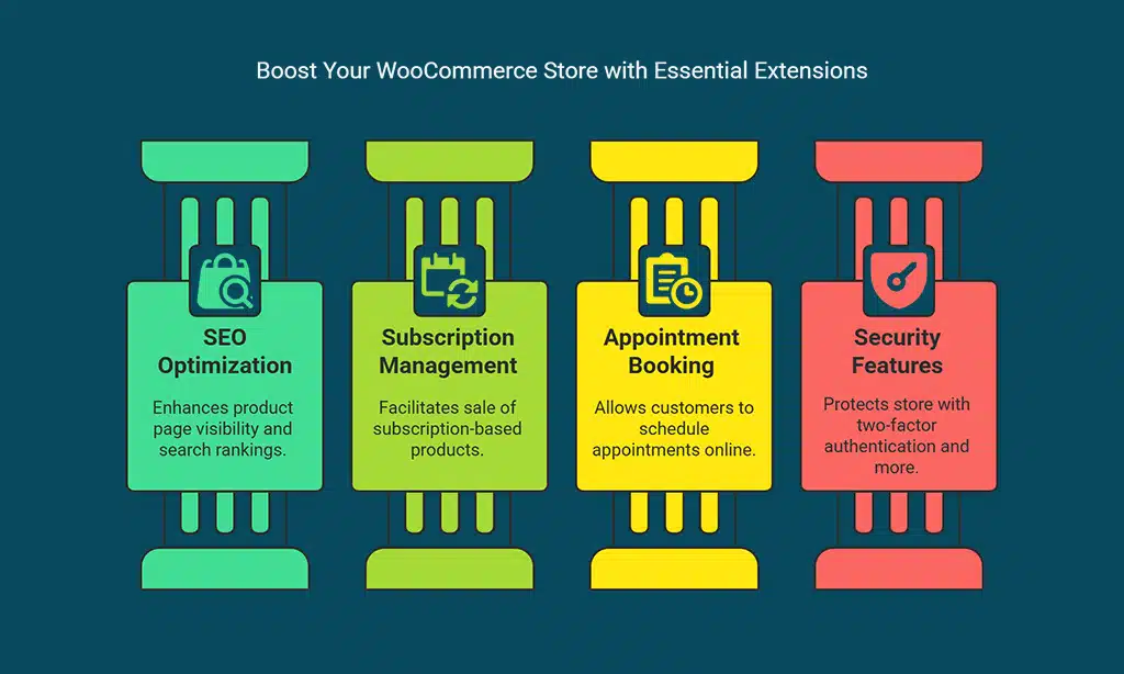 To enhance the functionality of your WooCommerce store, you can install several extensions to improve payment processing, SEO, and security.