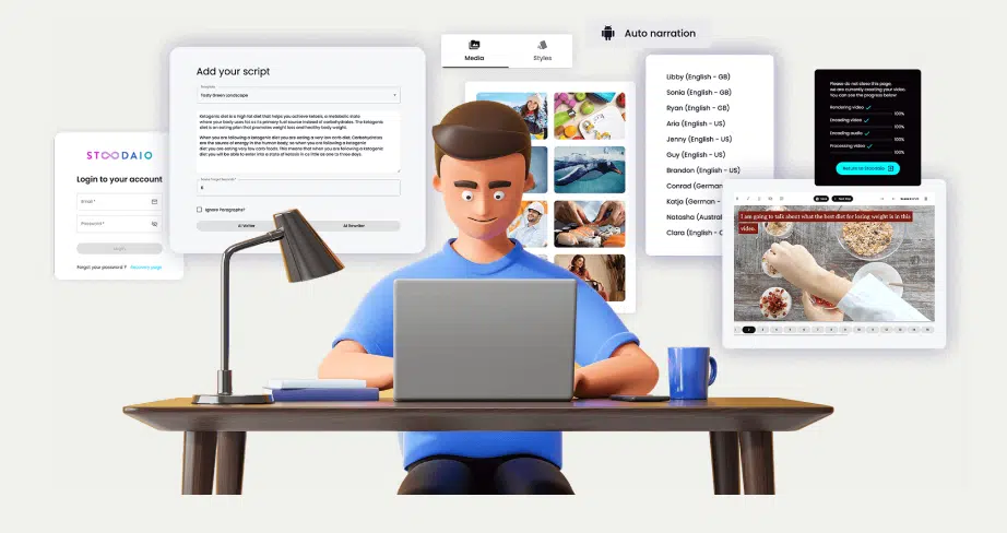 - We all know that Stoodaio will automatically make videos, but we still have the option to change each one and add other parts that meet our needs. You can change and add text, record your own voiceover, add your own screenplay, and even add narration that was already recorded if you want to. You can also add your own videos, photos, logos, and other media like background videos and logos.