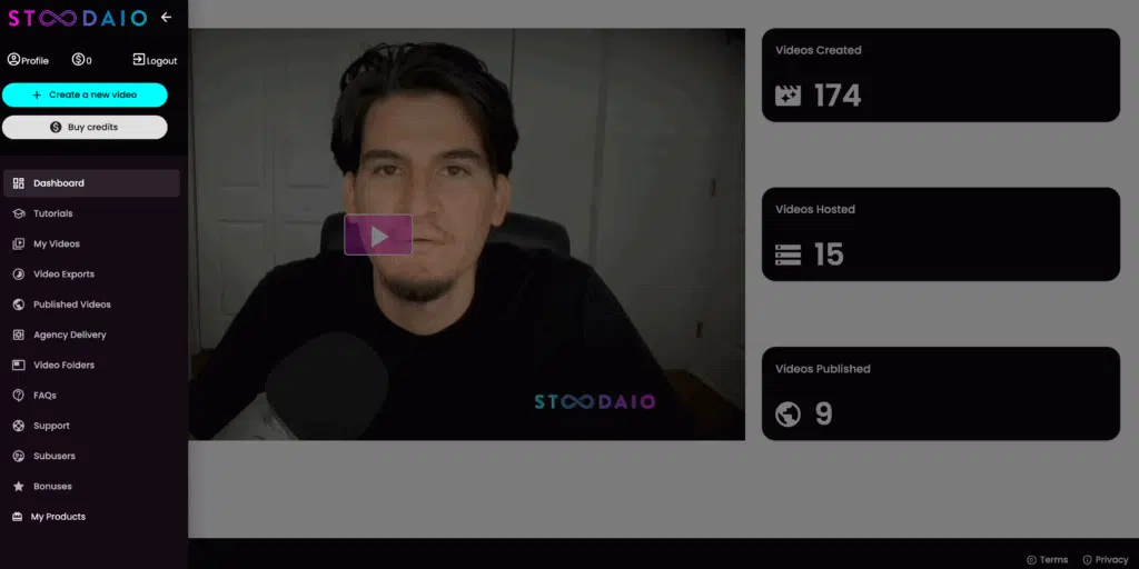 - The Front End is made up of the $44 Stoodaio 2.0 Agency software. The most popular level gives customers 25 credits that they can use right away to start having videos made for them.