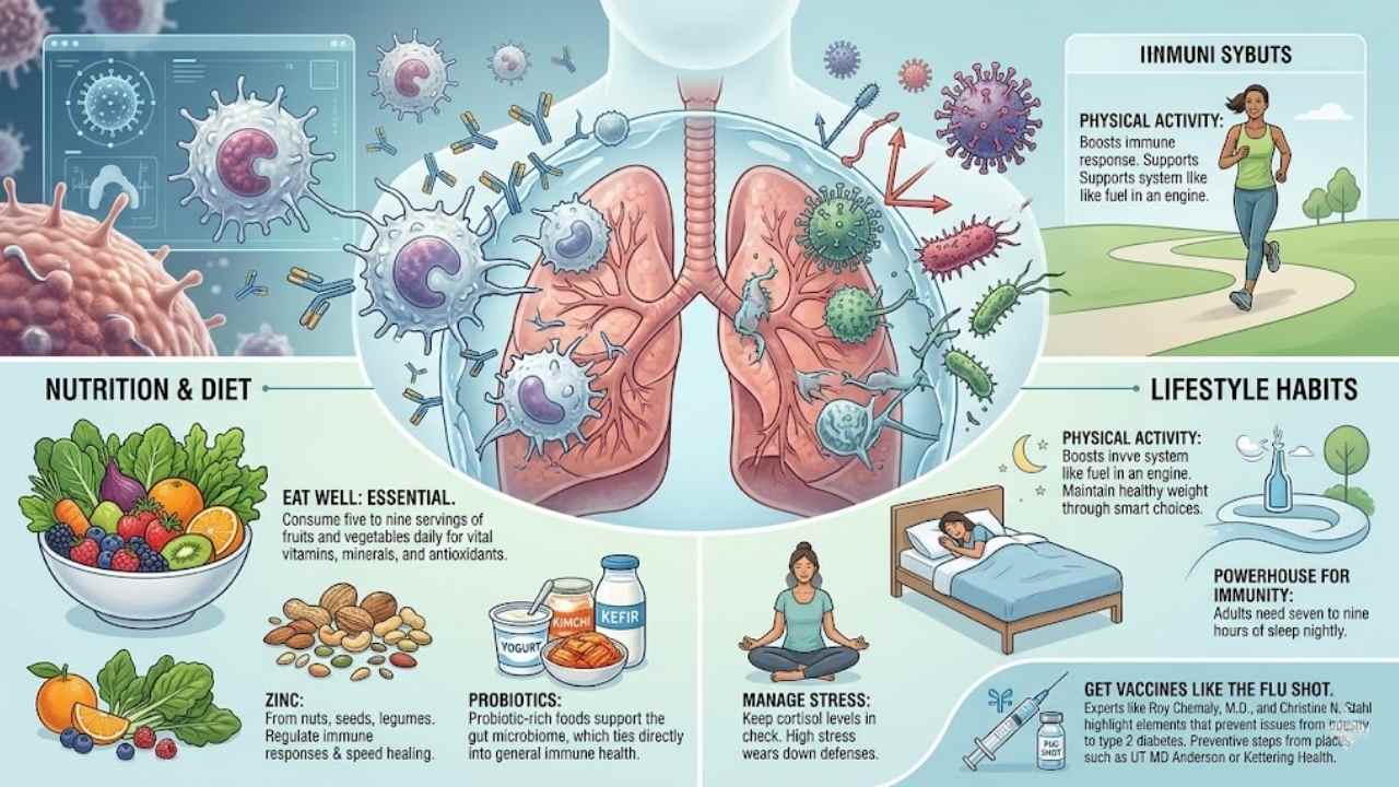 Manage stress to keep cortisol levels in check, since high stress can wear down your defenses. Add in exercise, vaccines like the flu shot, and preventive steps from places such as UT MD Anderson or Kettering Health.